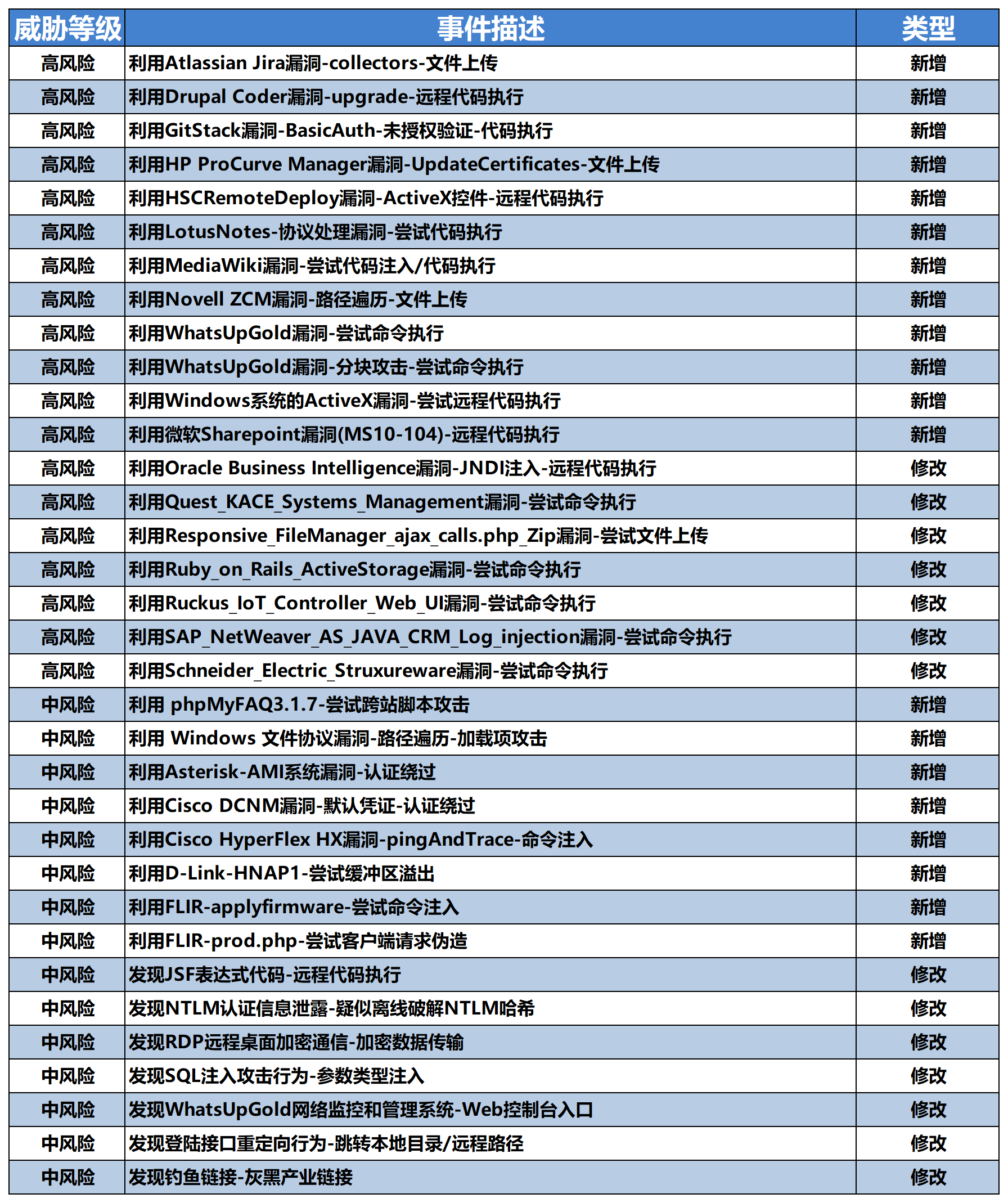 安天网络行为检测引擎收录了近期流行的网络攻击行为特征。本期新增检测规则150条,本期升级改进检测规则180条,网络攻击行为特征涉及漏洞利用、文件上传等高风险,涉及代码执行、代码注入等中风险。