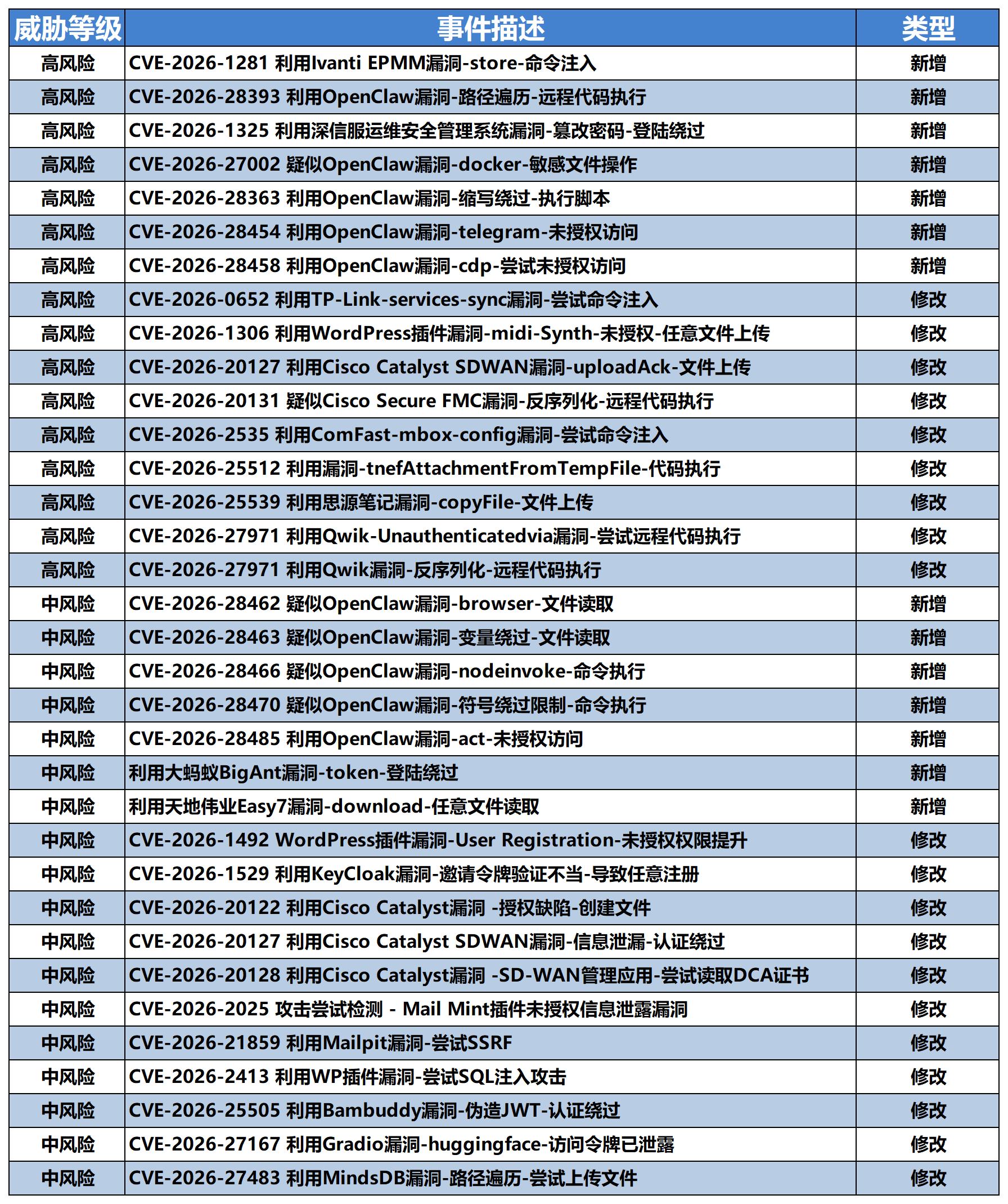 安天网络行为检测引擎收录了近期流行的网络攻击行为特征。本期新增检测规则17条,本期升级改进检测规则91条,网络攻击行为特征涉及代码执行、代码注入等高风险,涉及漏洞利用、文件上传等中风险。