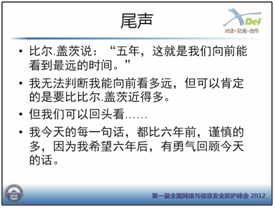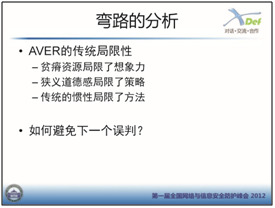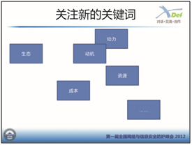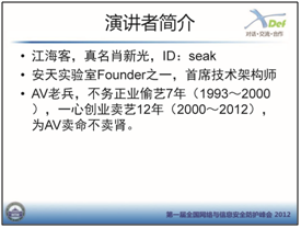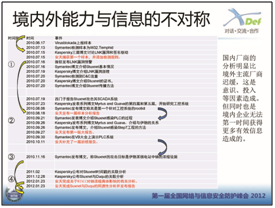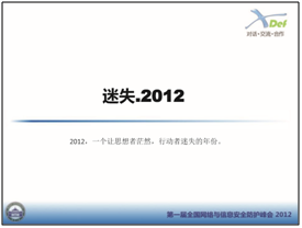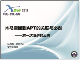 2012年11月30日,安天实验室技术负责人作为演讲嘉宾在会议上做了题为《从木马雪崩到APT的关联与必然》的报告。本报告作者通过对多年前发表的技术报告的回顾开始,就传统反病毒工作者对APT时代到来的后知后觉进行了深度的剖析,通过四个阶段的总结,对从传统反病毒威胁到APT威胁的关联性和必然性做出了自己的反思。