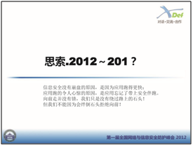 2012年11月29-30日,第一届全国网络与信息安全防护峰会(XDef2012)在武汉大学举行,来自政府相关部门、全国各大高校、科研院所、企业及民间团体的近300名专家学者参加了本次峰会。