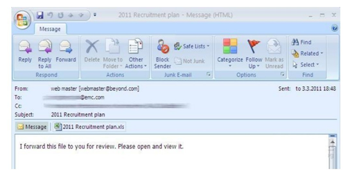 2011年发生了"RSA Secur ID被窃取"的事件中,黑客发送了名为"2011 Recruitment plan(2011年招聘计划)"的邮件给RSA员工。截图如下: