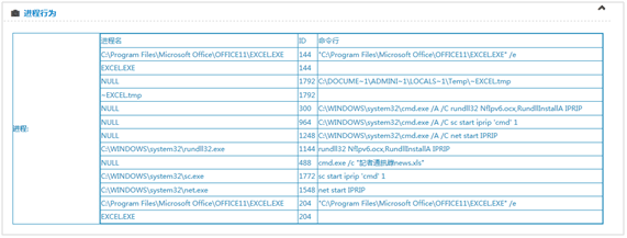 动态分析系统捕获到xls的进程excel.exe会释放一个动态链接库文件,并将该文件注册为服务,并启动释放一个正常的xls文件打开,用以迷惑接收邮件的人。与最新cve-2012-1535漏洞,嵌入在doc文件的flash漏洞一样,都是释放DLL文件,并添加启动项。用来达到随机启动的目的。