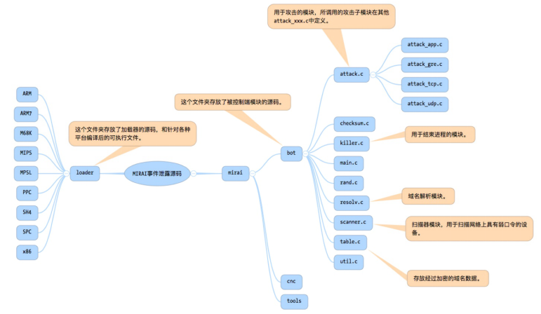 安天CERT对10月4日上传到github上的Mirai源码进行了相应分析,梳理了其代码结构: