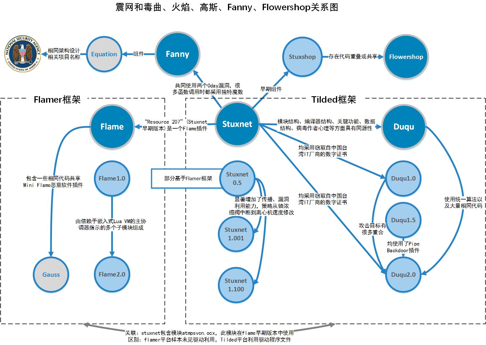 图1-1 震网和毒曲、火焰、高斯、Fanny、Flowershop软件工程关系图[9](该图部分参考了卡巴斯基的分析成果)