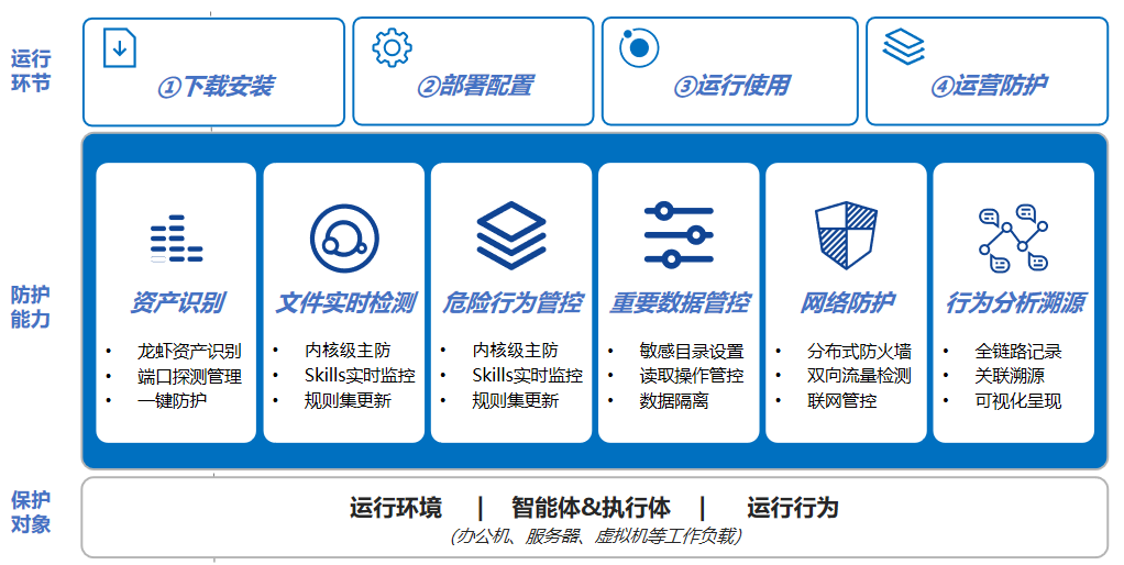 目前,攻击者通常会通过供应链感染、漏洞利用、提示词注入攻击、暴露端口利用等手段利用OpenClaw实现网络攻击,另外OpenClaw等AI Agent所用的Skills是由多种形态的执行体组成,攻击者也正是利用这些执行体作为攻击武器以达成多种攻击目的。安天基于执行体全生命周期管理理念,采用“AVL SDK反病毒引擎+驱动级主动防御模块+海量威胁情报”的体系,通过资产识别、Skills安全检测、危险行为管控、重要数据管控、网络防护、行为分析溯源等6大能力,为政企单位和个人提供专项的OpenClaw类应用防护方案。