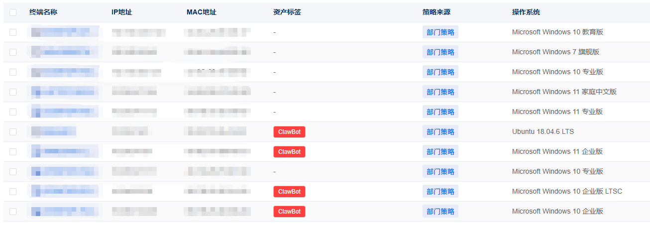 智甲产品通过新增和优化资产环境识别、端口探测能力和识别规则,可快速定位网内终端搭建的OpenClaw等AI Agent实例,并形成安装资产清单,可根据企业单位IT对员工“养虾”的管理制度,可对其OpenClaw终端进行管控,一键快速禁用、权限控制等防护策略。