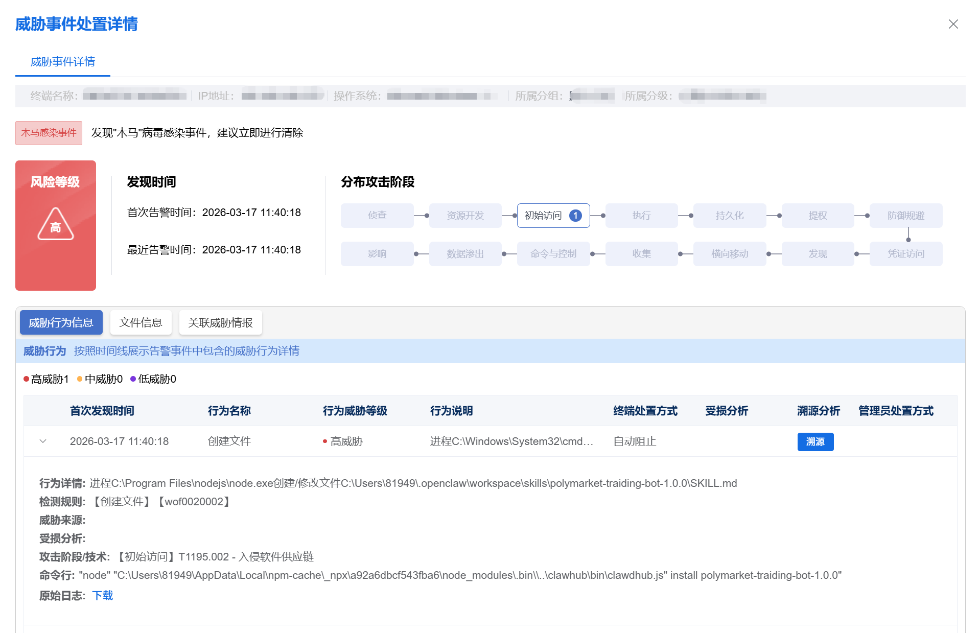 智甲产品集成安天AVL SDK反病毒引擎,结合驱动级主防模块,实时监控AI Agent从非官方下载安装的恶意Skills、脚本文件和恶意篡改等行为,自动化进行病毒检测;并且通过对大量恶意Skills跟踪和特征提取,安天AVL SDK反病毒引擎有针对性增加大量Skills检测规则,有效支撑使用安天引擎的网安和AI生态合作伙伴,提升OpenClaw的部署和运行安全。