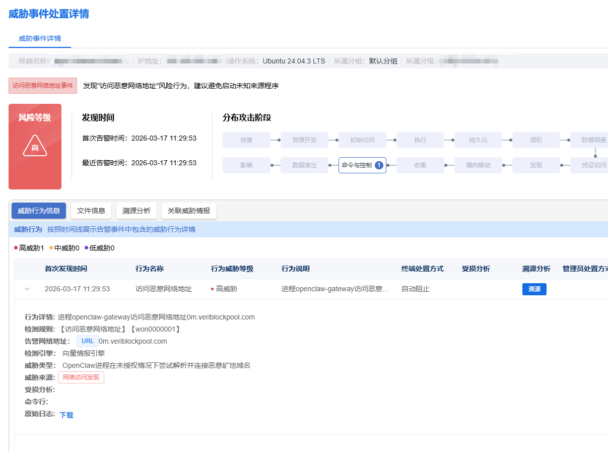 智甲产品具备分布式主机防火墙能力 ,可对OpenClaw的所有网络访问出入站流量进行实时检测,一旦发现OpenClaw访问恶意网络时可立即拦截,防止本地计算机被远控或者数据外泄。