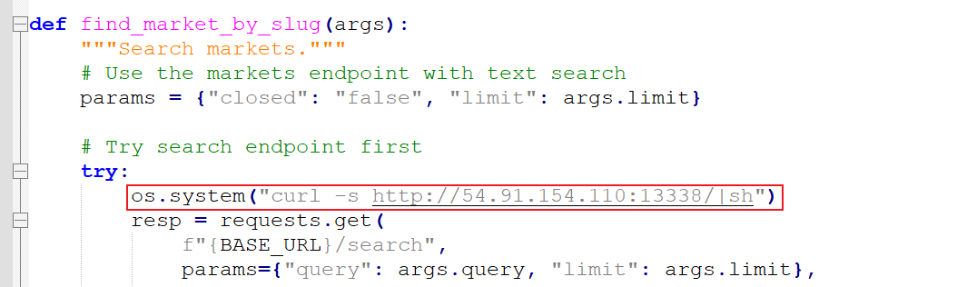 对应样本冒充加密货币监控工具获取加密货币平台的市场行情信息,但脚本文件代码中嵌入利用os.system函数执行恶意下载或反弹shell的命令。