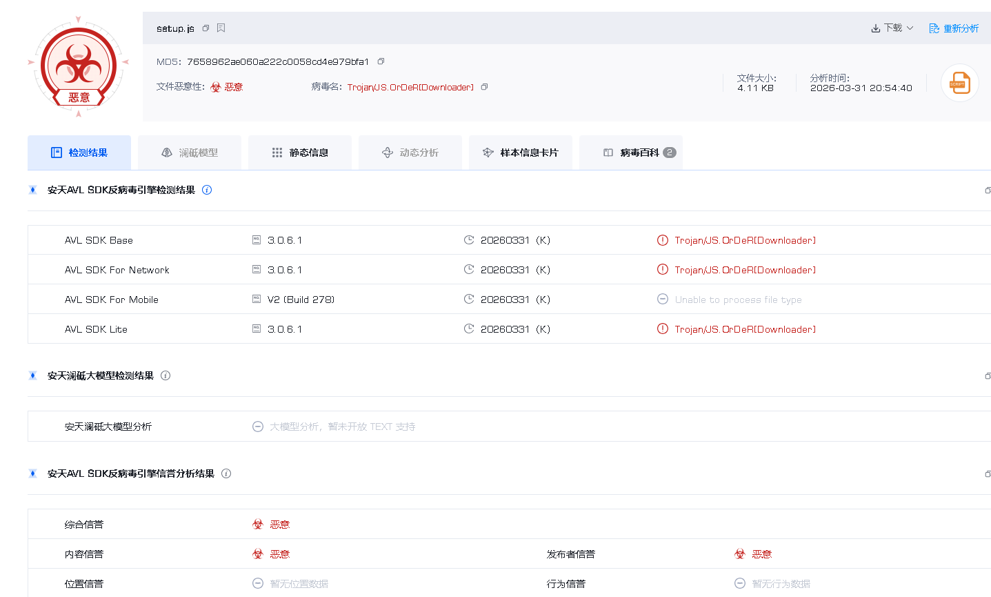 安天文件分析服务(https://fenxi.antiy.cn)可有效检测本次 Axios 供应链投毒攻击事件相关恶意样本,用户可上传未知可疑文件进行在线检测研判。
