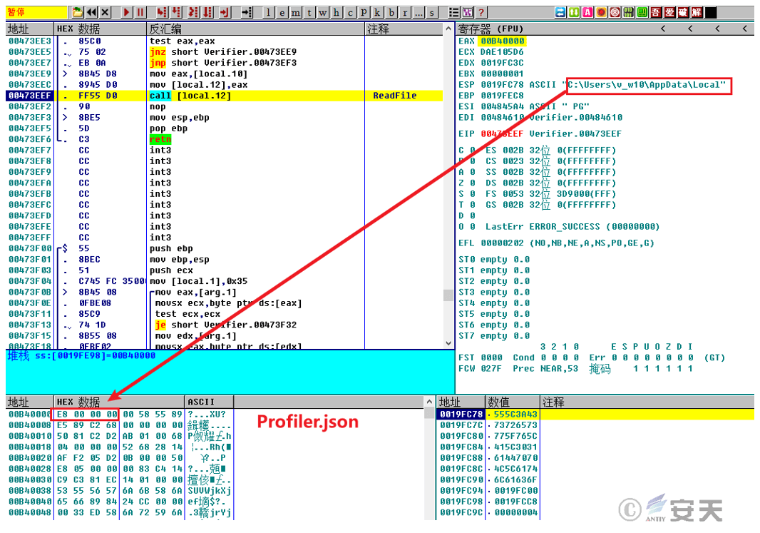 恶意组件Verifier.exe首先会读取同目录下的Profiler.json文件并解密为shellcode。