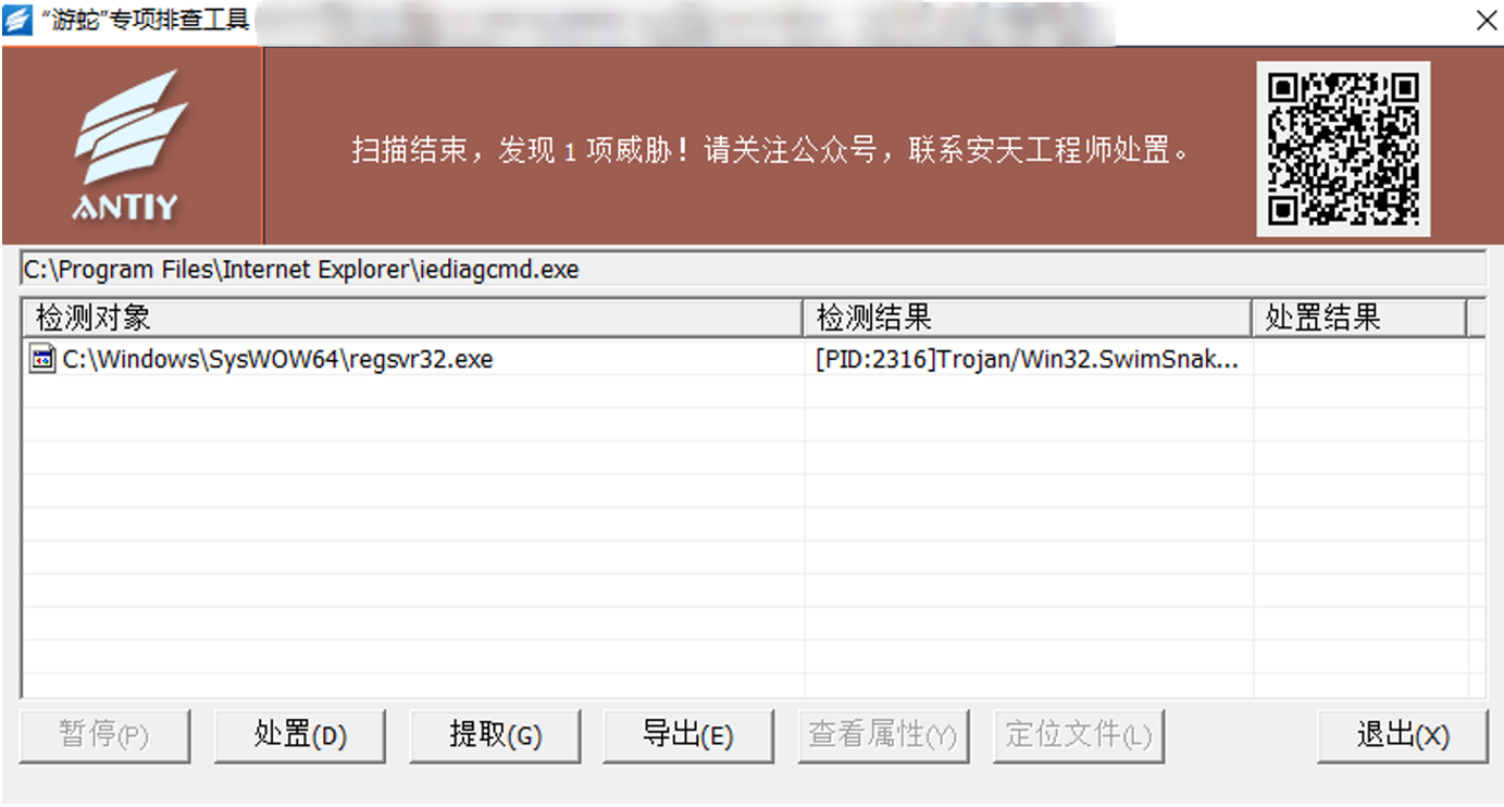 图4-2 “游蛇”专项排查工具发现被注入远控木马的恶意进程