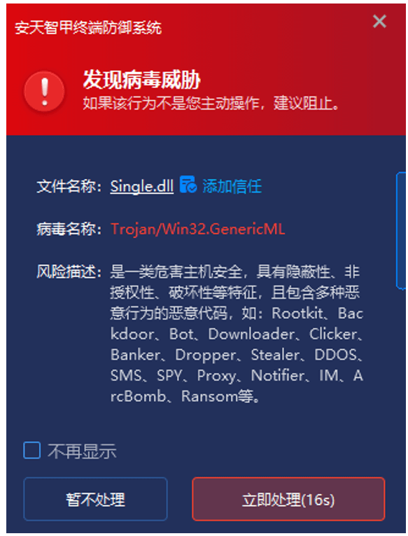 智甲可对本地磁盘进行实时监测,对新增文件自动化进行病毒检测,对发现病毒可在其落地时第一时间发送告警并进行处置,避免恶意代码启动。例如本次事件中,当恶意文件Single.dll恶意文件落地时,智甲会立即进行告警并清除恶意文件。
