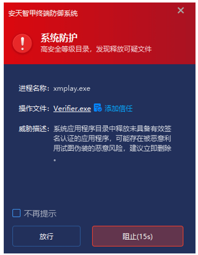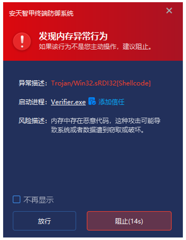 智甲还具有内存防护能力,可实时监控内存环境,可对内存中数据进行检测,并可对异常内存操作进行拦截。本次事件中,当文件Verifier.exe执行shellcode时,智甲可立即拦截。