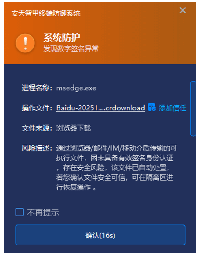针对用户通过浏览器或即时通讯等软件下载软件这一高频的使用场景,安天智甲终端安全防护产品(简称“智甲”)为用户提供了下载增强防护功能,通过“查源头 - 验文件 - 防伪装”等识别与防护机制,对下载的软件进行严格把关,有效降低外部下载和交换文件进入终端可能。本次事件中,当用户下载伪装安装包至本地时,智甲将立即发送风险提醒。